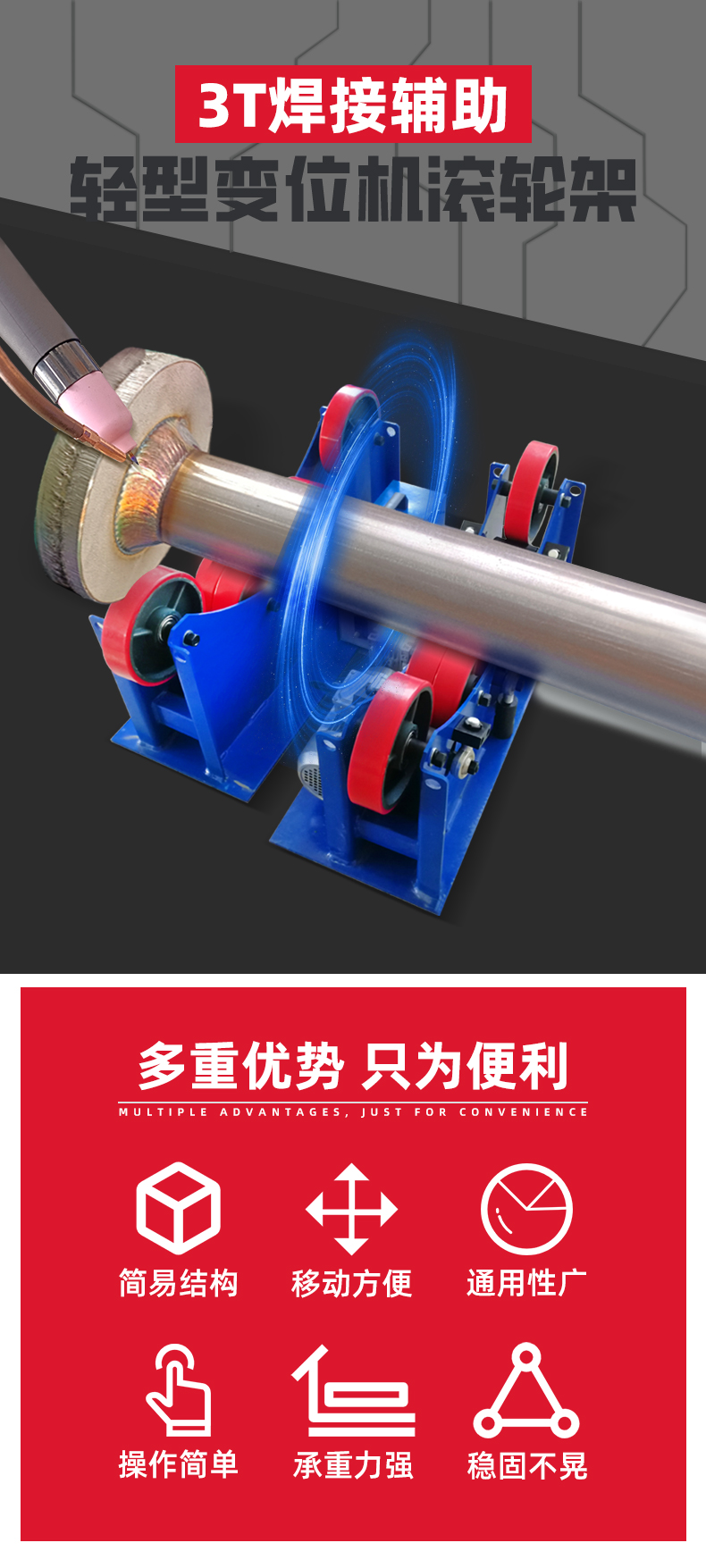 鑫浩3噸焊接滾輪架具有結構簡單、移動方便、通用性廣的特點,